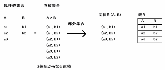実体が持つ属性を仮にA、Bとする。このA、Bの値の集合(これを属性値集合または定義域という)から直積を作る。作られた直積の部分集合を関係という。