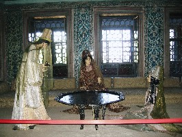 | スルタンの母の部屋。母君と姫君たちでしょうか?人形がおいてありました。スルタンの母は、ハレムの最高権力者だということで、日本の大奥に通じる怖さを感じてしまいます。 | |