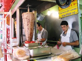 | トラムに乗って、エミノニュに移動。そこで、ケバブのランチにしました。エアコンがない店が多くて、暑くて大変。 ケバブも、パンにはさんだり、ケンタッキーのツイスターのような薄い生地でまいたり、皿に盛ったり、いろいろなバージョンがありました。結局ランチは、毎日ケバブでした。特大のベークドポテトにいろいろ具をのせたクンピールや、塩味のヨーグルトドリンク、アイランも美味。 |